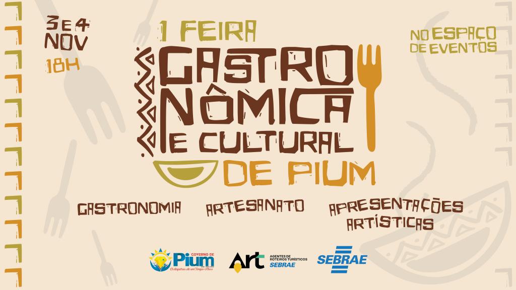 Nos dias 3 e 4 de novembro, Pium recebe a primeira edição da Feira Gastronômica e Cultural do Município. Cerca de 14 pequenos negócios farão a exposição de produtos valorizando a gastronomia típica e artesanatos regionais. A Feira, que acontecerá das 18h às 22h no Espaço de Eventos de Pium, é uma realização da Prefeitura de Pium, através da Secretaria de Juventude e Cultura, em parceria com o Sebrae Tocantins.
