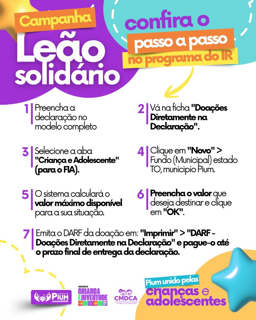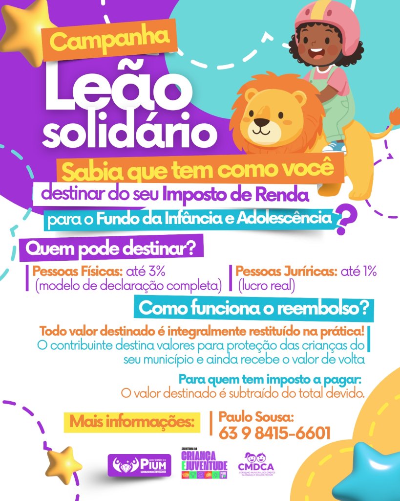 A Prefeitura de Pium, por meio da Secretaria da Criança e Juventude e do CMDCA, convida você a participar da campanha Leão Solidário. A iniciativa permite transformar parte do Imposto de Renda em investimento direto em projetos sociais do município.